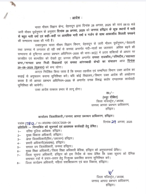 उक्तानुसार भारत मौसम विज्ञान विभाग, देहरादून से जारी मौसम पूर्वानुमान / चेतावनी तथा जनपद में लगातार हो रही वर्षा से जनपद अन्तर्गत नदी-नालों का जलस्तर अधिक बढ़ने की सम्भावना के दृष्टिगत आपदा प्रबन्धन अधिनियम-2005 की धारा-30 (2) में प्रदत्त शक्तियों के आधार पर छात्रहित एवं बाल्यहित को देखते हुए जनपद हरिद्वार अन्तर्गत समस्त राजकीय / परिषदीय / सहायता प्राप्त/मान्यता प्राप्त निजी विद्यालयों एवं समस्त आंगनबाडी केन्द्रो का संचालन आज दिनांक
