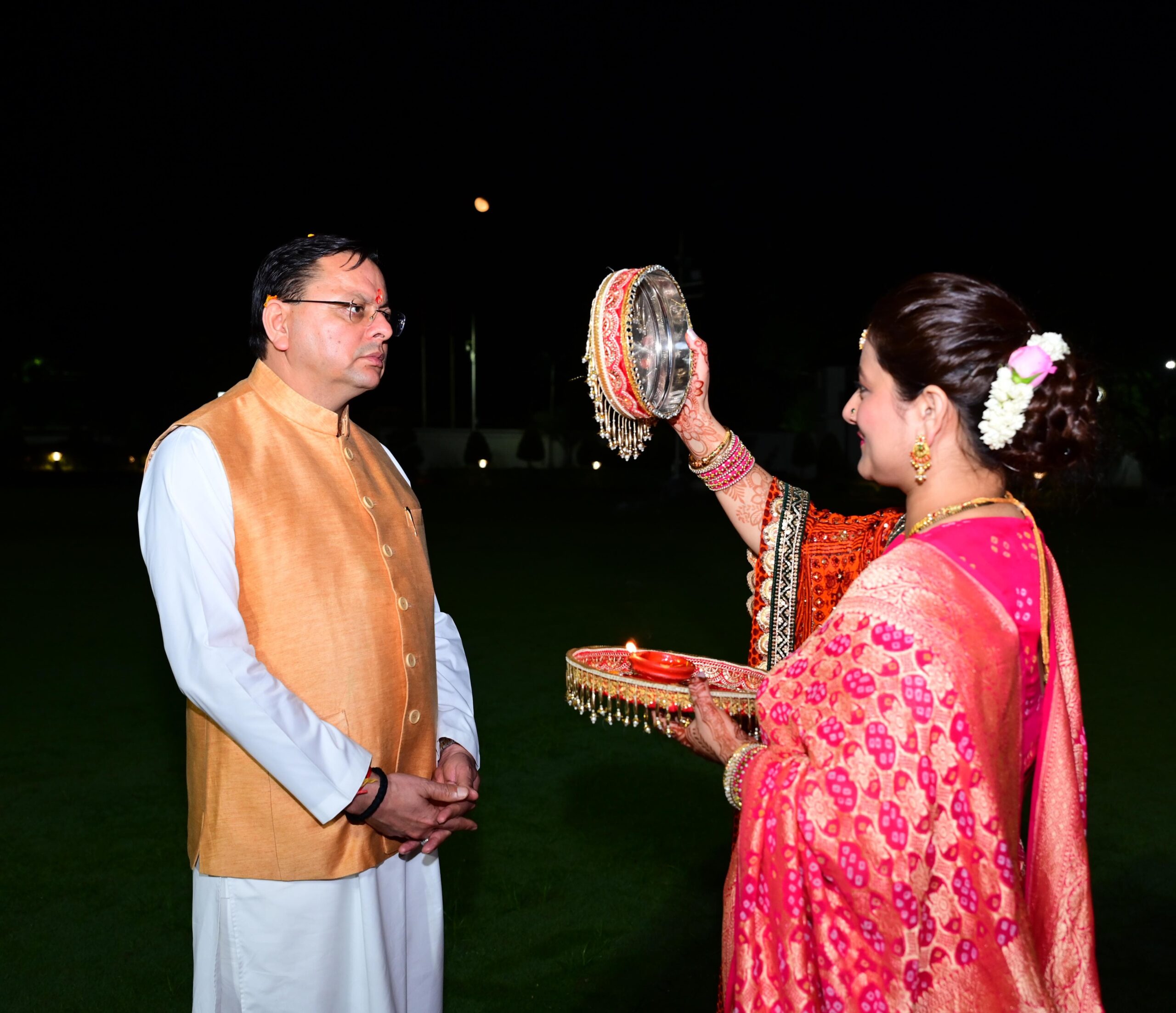 रात्रि के समय चंद्रमा को अर्घ्य अर्पित कर श्रीमती गीता धामी ने मुख्यमंत्री श्री पुष्कर सिंह धामी के साथ विधि विधानपूर्वक करवा चौथ के व्रत का समापन किया।