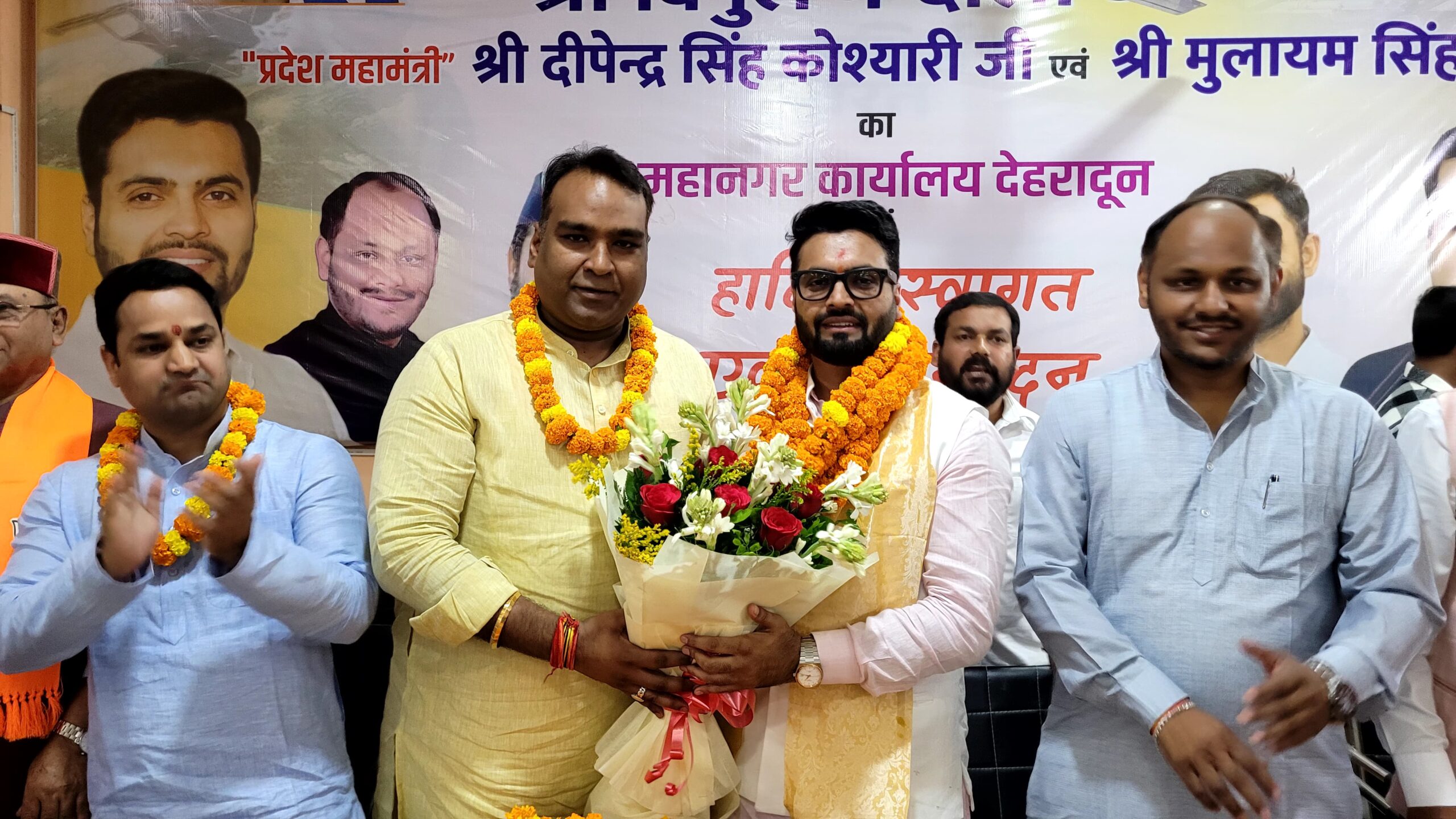 आज  भारतीय जनता पार्टी महानगर देहरादून के अध्यक्ष श्री सिद्धार्थ उमेश अग्रवाल जी की अध्यक्षता में भारतीय जनता युवा मोर्चा (भाजयुमो) के प्रदेश अध्यक्ष विपुल मैंदोली, प्रदेश महामंत्री मुलायम सिंह रावत और दीप कोश्यारी जी (दीपेंद्र) का भारतीय जनता पार्टी महानगर कार्यालय में भव्य स्वागत एवं अभिनंदन किया गया। इस अवसर पर पार्टी कार्यकर्ताओं में जोश और उत्साह का वातावरण देखने को मिला। पूरे कार्यालय परिसर को भगवा पताकाओं, पुष्पमालाओं और बैनरों से सजाया गया था।
