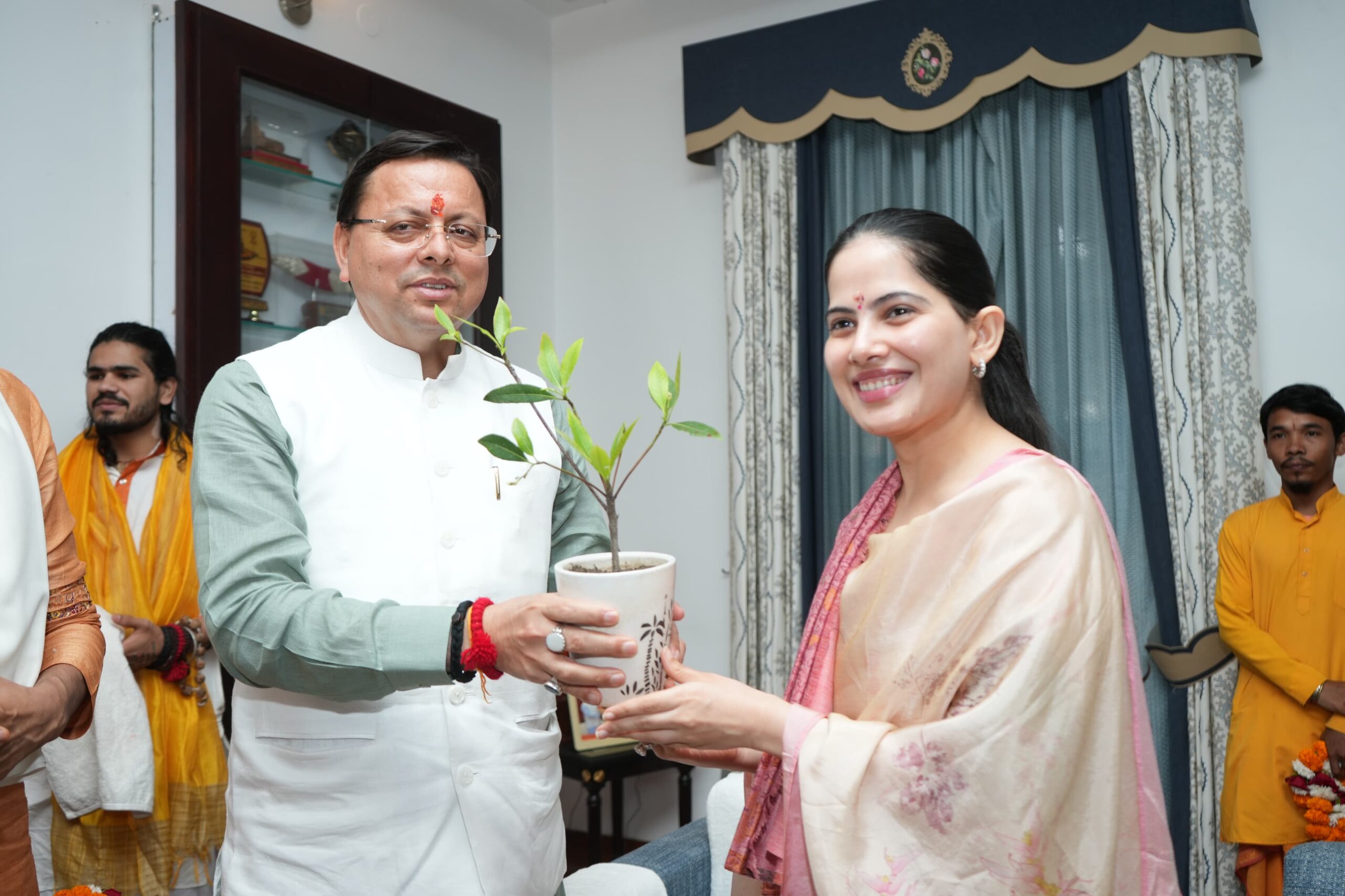 मुख्यमंत्री आवास में आध्यात्मिक संगम में जगद्गुरु शंकराचार्य राजराजेश्वर महाराज, आचार्य महामंडलेश्वर कैलाशानंद गिरी जी महाराज, जूनापीठाधीश्वर आचार्य महामंडलेश्वर स्वामी अवधेशानंद गिरि जी,परमार्थ निकेतन, ऋषिकेश के अध्यक्ष पूज्य स्वामी चिदानंद सरस्वती जी,अखाड़ा परिषद अध्यक्ष स्वामी रविंद्रपुरी महाराज, बागेश्वर धाम पीठाधीश्वर पं. धीरेंद्र कृष्ण शास्त्री,पतंजलि योगपीठ के आचार्य बालकृष्ण,प्रसिद्ध आध्यात्मिक वक्ता जया किशोरी,चिंतक और लेखक डॉ. कुमार विश्वास सहित अनेकों प्रतिष्ठित संत-महात्मा एवं धर्माचार्य भेंट करने वाले प्रमुख संत-महात्माओं में शामिल रहे