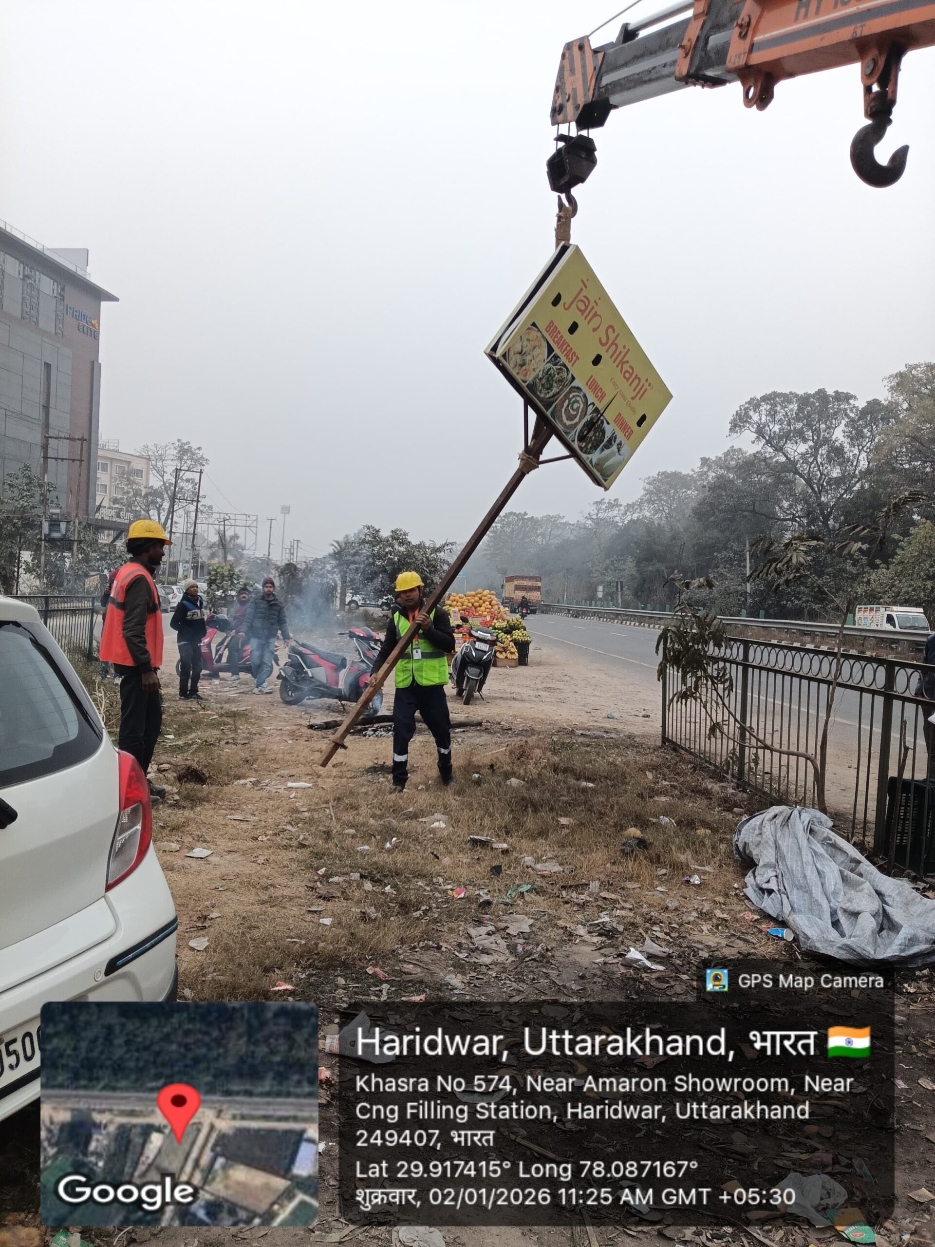 अधिशासी अभियंता एनएचएआई अतुल शर्मा ने अवगत कराया है कि जिलाधिकारी के निर्देशों के अनुपालन में राष्ट्रीय राजमार्ग संख्या 334 के किनारों से एवं रानीपुर झाल से बहादराबाद बाईपास तक एवं मंगलौर क्षेत्रांतर्गत अवैध रूप एवं बिना अनुमति के लगाए गए होर्डिंग एवं 14 बड़े यूनीपोल को राष्ट्रीय राजमार्ग प्राधिकरण द्वारा अधिकृत एजेंसी की टीम द्वारा हटाया गया। उन्होंने यह भी अवगत कराया है कि राष्ट्रीय राजमार्ग के किनारे बनाए गए खोखे, झुगी झोपड़ी को भी हटाया जा रहा है।