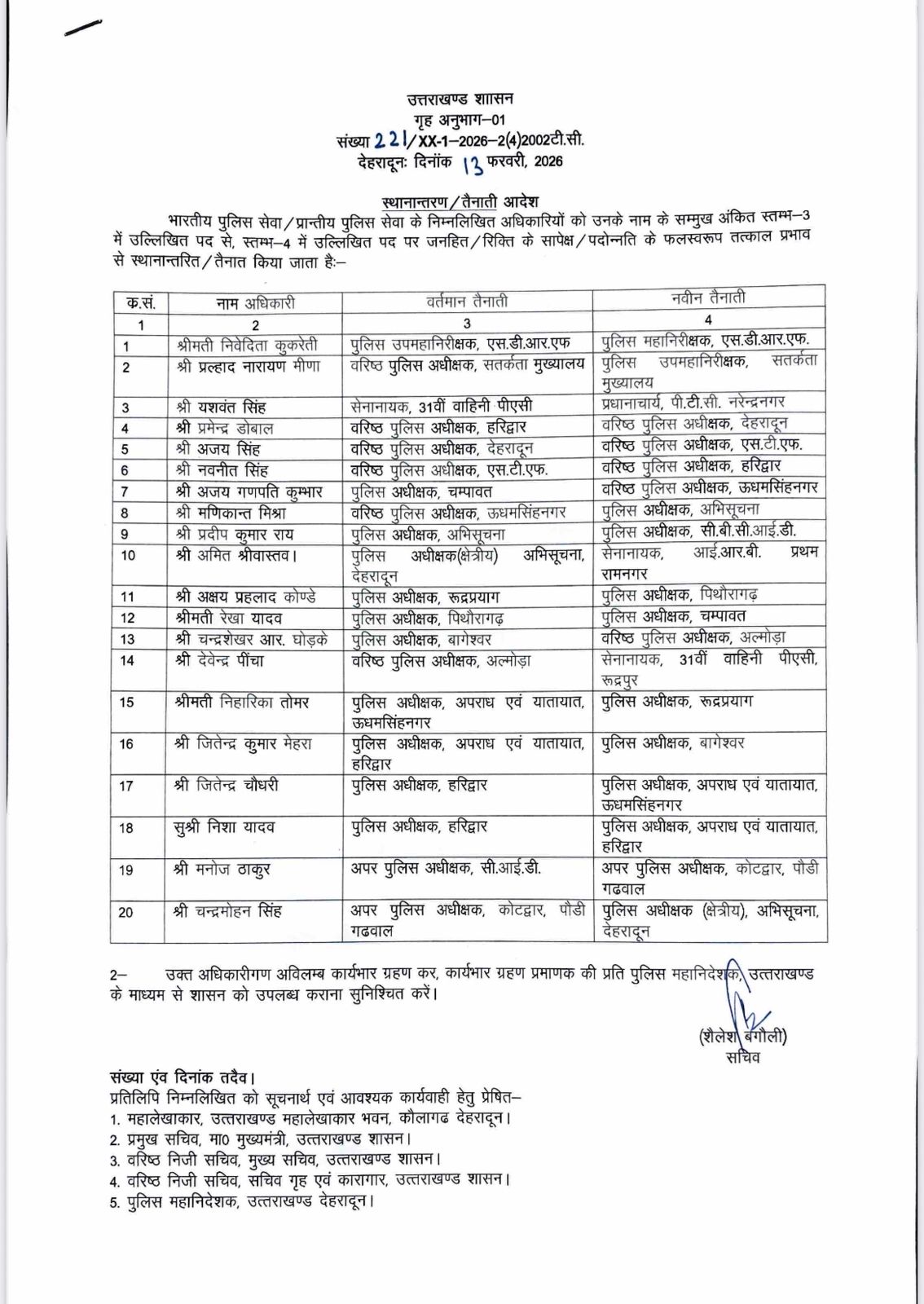 उत्तराखंड सरकार ने बढ़ती आपराधिक घटनाओं के बीच पुलिस विभाग के 20 बड़े अधिकारियों का फेरबदल कर दिया है। नए आदेश के तहत तीनों मैदानी जिलों- देहरादून, हरिद्वार और ऊधम सिंह नगर के वरिष्ठ पुलिस अधीक्षकों (SSP) को बदल दिया गया है।