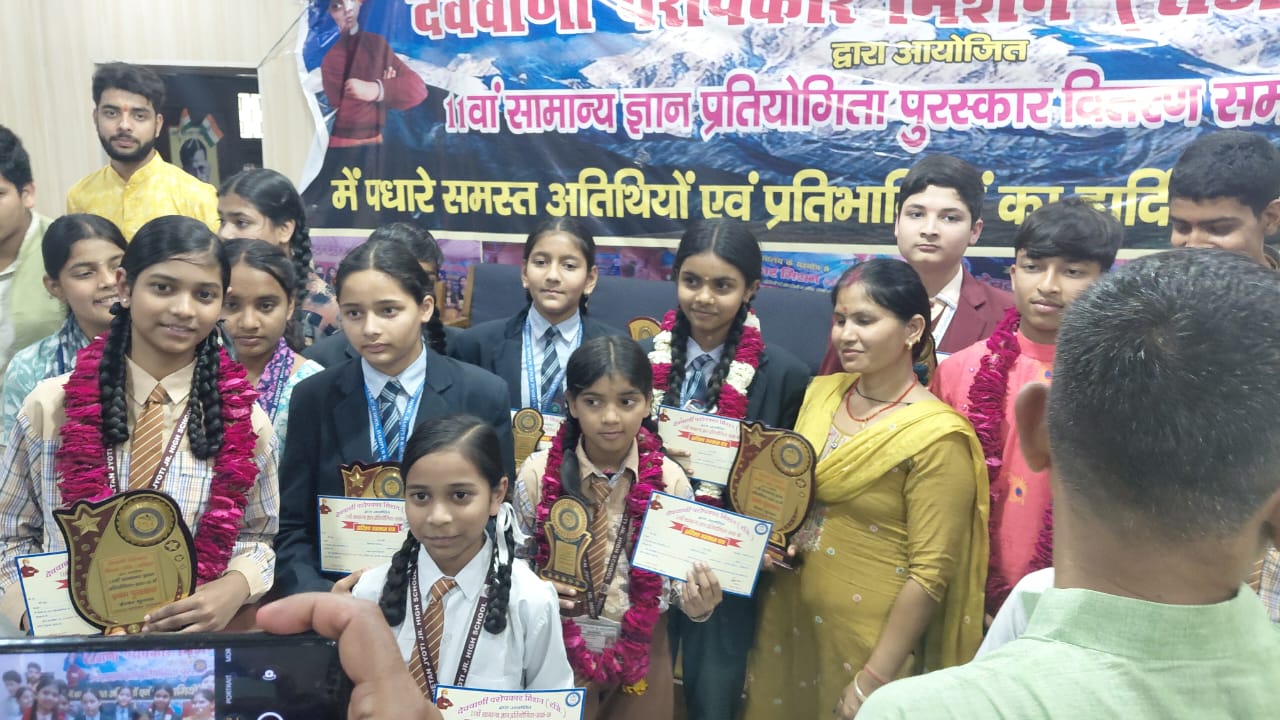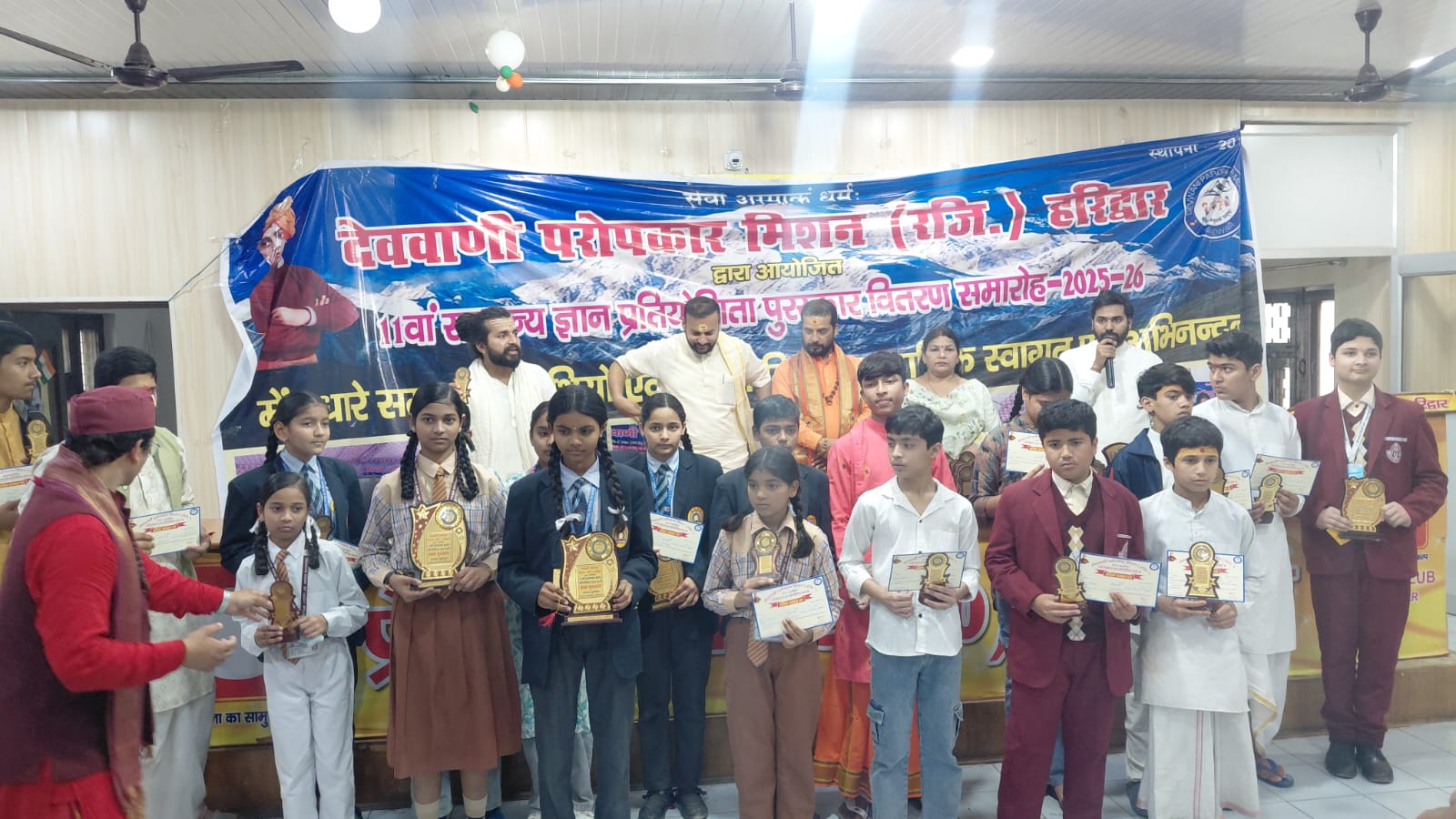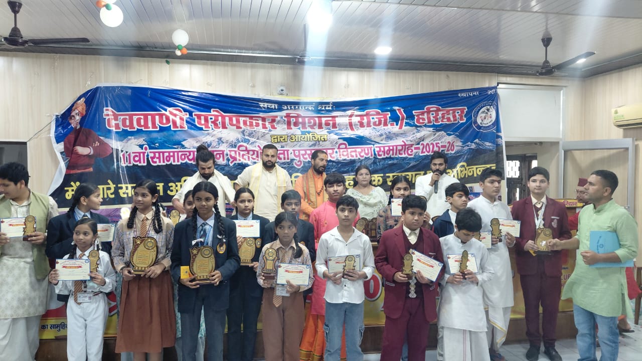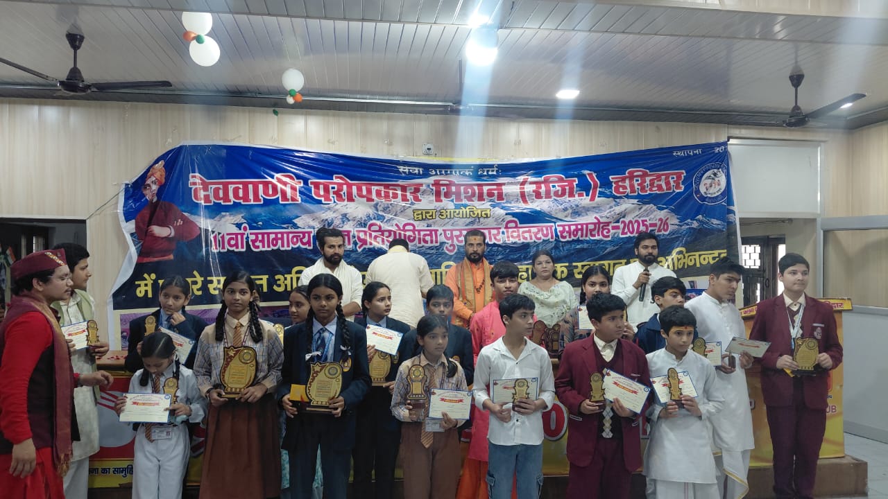 5100,₹2100 और ₹1100 नगद पुरस्कार प्रदान किया गया इसके साथ ही हिमालयन अकैडमी हिमांगी, अंशिका , दून पब्लिक स्कूल के गुंजन सिंह, गिरीश चंद्र रवाली, हरि भारती संस्कृत विद्यालय में राहुल भट्ट ,सरोज ,आयुष गॉड शिव नेशनल स्कूल से स्नेहा गुप्ता ,प्राची भारद्वाज आयुषी जोशी सप्त ऋषि संस्कृत विद्यालय से रवि पांडे ,रोशन कुमार दुबे भागीरथी विद्यालय सार्थक राणा को मंच पर शील्ड प्रमाण पत्र देकर सम्मानित किया गया इस मौके पर कार्यक्रम में मुख्य अतिथि हरिद्वार नगर निगम महापौर श्रीमती किरण जैसल ने कहा कि छात्र-छात्राओं में स्कूली ज्ञान के साथ-साथ सामान्य ज्ञान होना बहुत जरूरी है इससे छात्रों को एक मंच मिलता है और अपनी प्रतिभा साबित करने का अवसर होता है जो आने वाले प्रतियोगी परीक्षाओं में उनके लिए मील का पत्थर साबित होगी उन्होंने ऐसे आयोजन पर देववाणी परोपकार मिशन को शुभकामनाएं दी गरीब दासी आश्रम के अध्यक्ष स्वामी रवि देव शास्त्री ने कहा कि हिंदी संस्कृत सामान्य ज्ञान प्रतियोगिता से छात्र-छात्राओं में प्रतिस्पर्धा का मार्ग खुलता है छात्रों को अध्ययन अध्यापन के साथ सामान्य ज्ञान बहुत जरूरी है आज के इस भौतिक आधुनिक युग में पूरे विश्व भर की खबरें हर किसी को पता होना चाहिए इस मौके पर युवा भारत साधु समाज के राष्ट्रीय अध्यक्ष शिवम महंत ने कहा कि संस्कृत हिंदी सामान्य ज्ञान प्रतियोगिता बहुत ही उपयोगी है जहां छात्रों को संस्कृत और हिंदी अंग्रेजी सभी माध्यमों के छात्रों को एकजुट होकर परीक्षाएं देनी हो रही हैं इस अवसर पर कार्यक्रम अध्यक्ष ईश्वर सुयाल ने सभी का अभिनंदन स्वागत किया इस मौके पर विनय यादव मोहित जोशी नवीन सुयाल राहुल भट्ट स्नेहा गुप्ता राजवीर सिंह मुकेश सैनी प्रदीप कुमार कमल किशोर प्राची देवी गुंजन सिंह आयुषी जोशी आदि उपस्थित रहे
