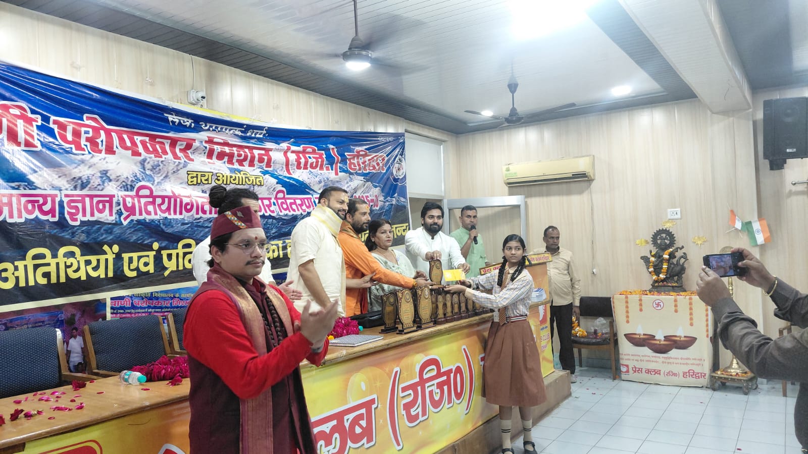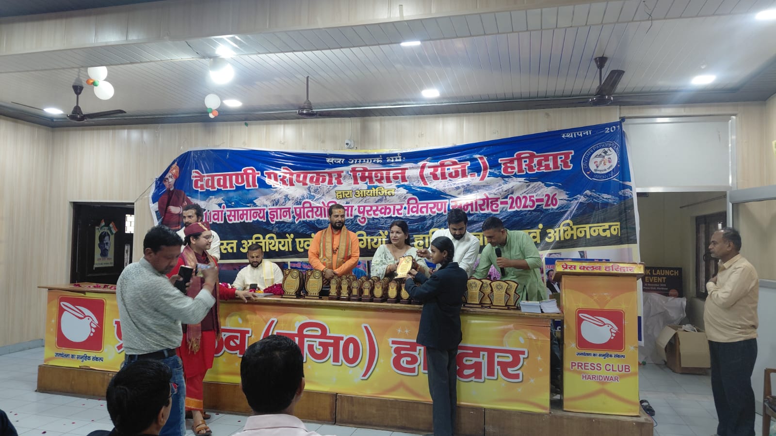 हरिद्वार।आज देववाणी परोपकार मिशन हरिद्वार द्वारा 11 वां सामान्य ज्ञान प्रतियोगिता 2025 ,26 प्रेस क्लब हरिद्वार में पुरस्कार वितरण किया गया देववाणी परोपकार मिशन के अध्यक्ष ईश्वर सुयाल ने बताया कि सामान्य ज्ञान प्रतियोगिता में प्रथम द्वितीय तृतीय छात्र-छात्राओं को नगद पुरस्कार एवं शील्ड प्रमाण पत्र देकर सम्मानित किया गया जिसमें प्रथम स्थान आलोक पांडे वेद विद्यार्थी देहरादून जया रेडियंट पब्लिक स्कूल द्वितीय स्थान प्राची भारद्वाज सिवा नेशनल स्कूल भव्य कानेकर ,साध्वी आनंद ज्योति स्कूल ने संयुक्त रूप से तृतीय स्थान राशि अग्रवाल चेतन ज्योति जूनियर हाई स्कूल ,सारांश कौशिक भागीरथी विद्यालय हरिपुर ने संयुक्त रूप से प्राप्त किया प्रतिभागियों को संयुक्त रूप से क्रमशः